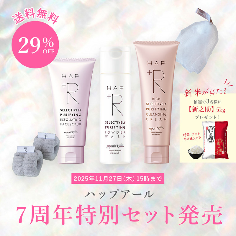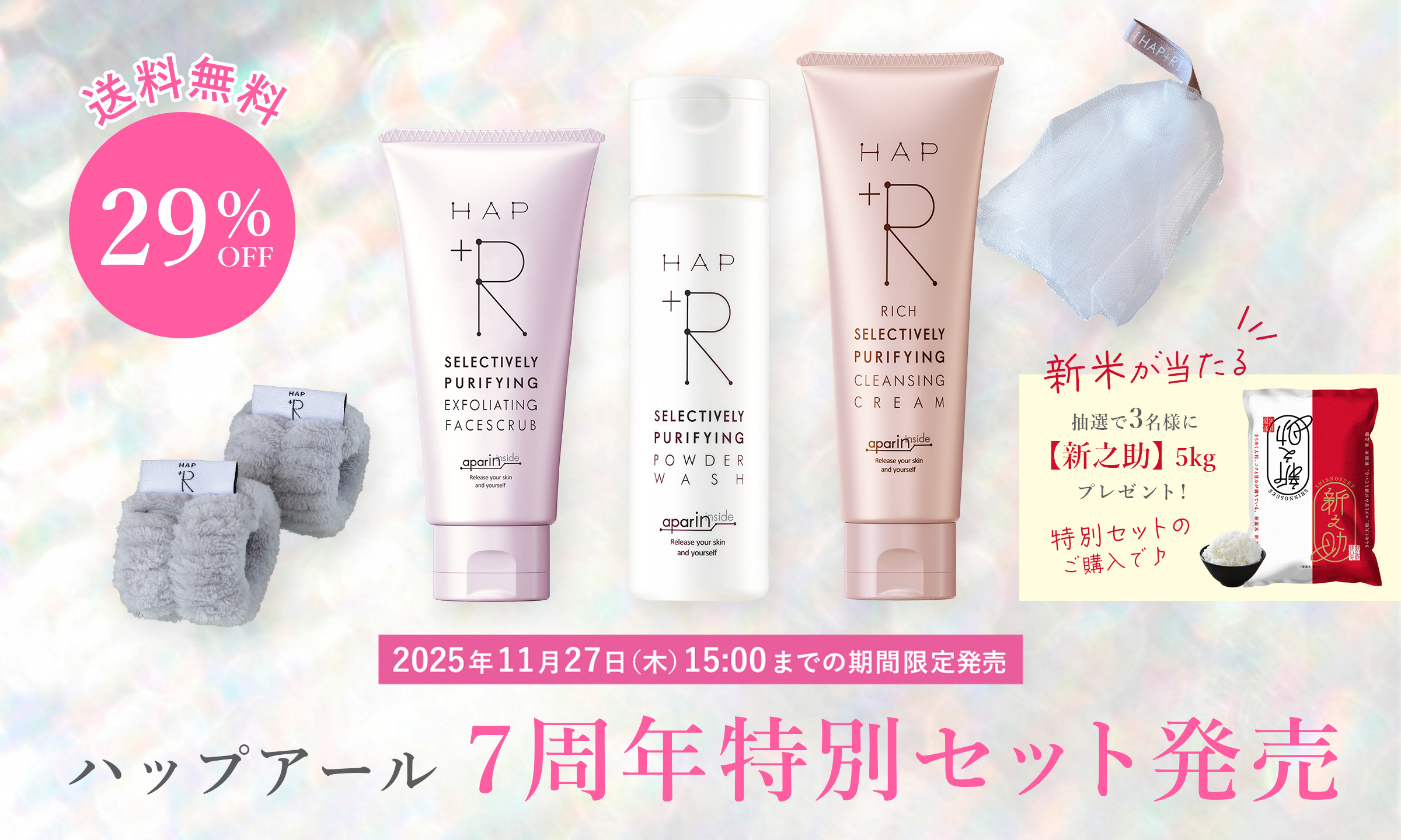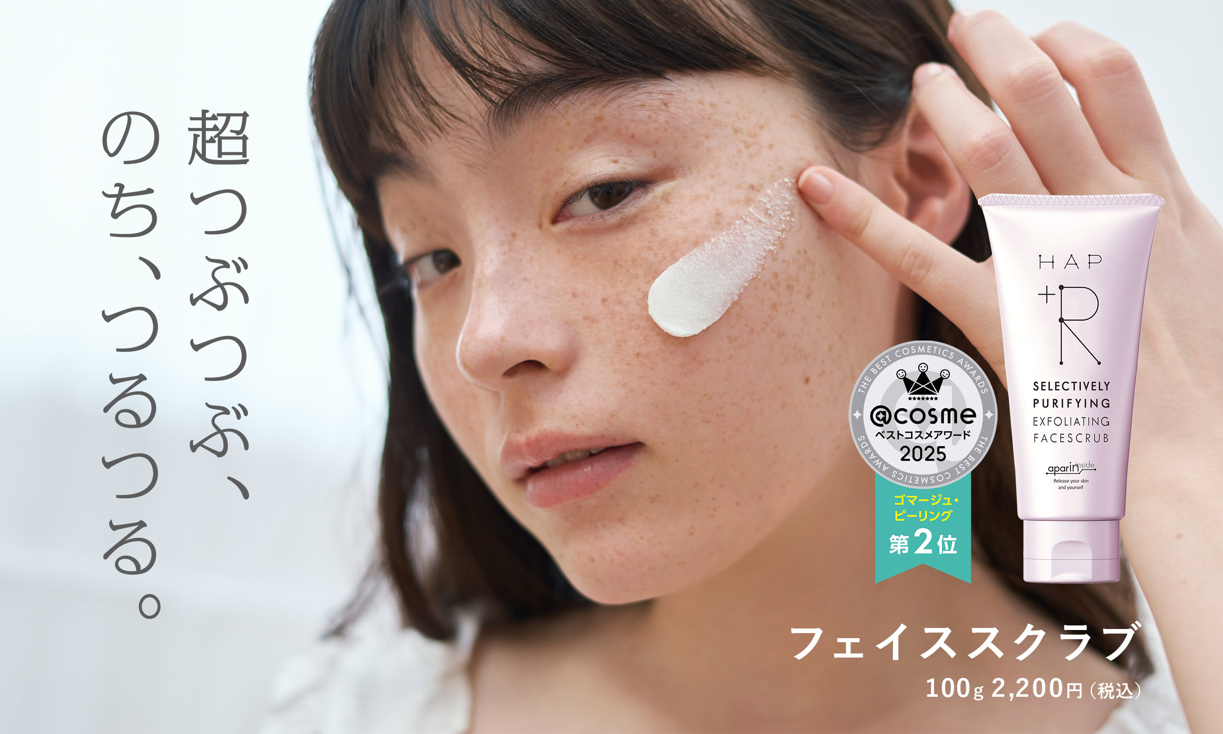 100g 2,200円(税込) - ざらつき、くすみ※1、毛穴汚れが気になる方へ、ハップアール初のスペシャルケアアイテム。スキンケア用アパタイト「アパリン®」※2 をスクラブ粒子に。酸化した皮脂や古い角質を吸着してオフします。心地よいつぶつぶ感のために、スクラブは丸い粒状につくりあげました。やさしくクルクルした後は、思わず触れたくなるスベスベ肌に。※1汚れや古い角質による
