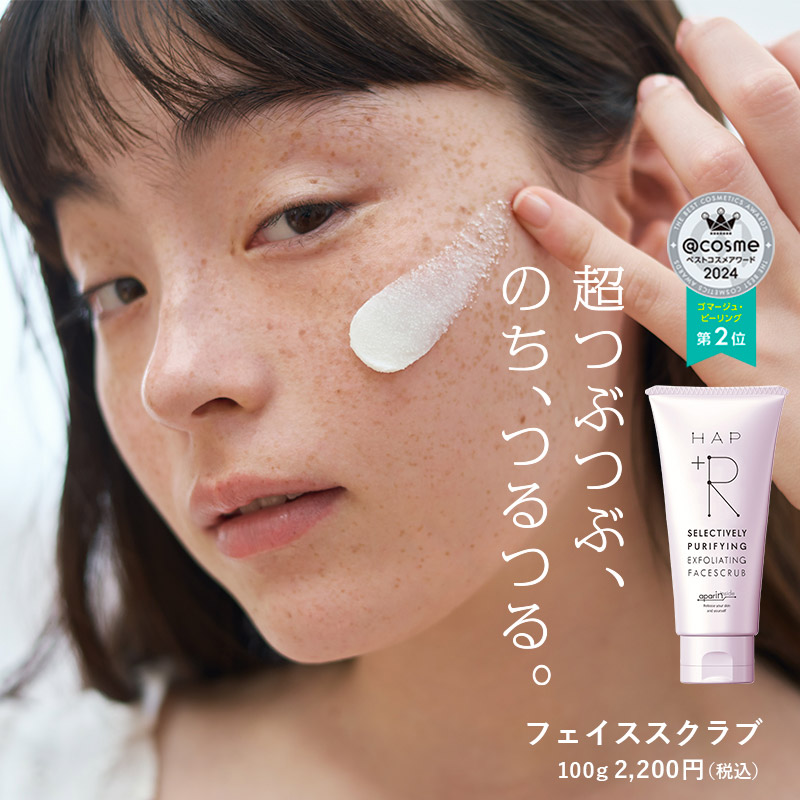 100g 2,200円(税込) - ざらつき、くすみ※1、毛穴汚れが気になる方へ、ハップアール初のスペシャルケアアイテム。スキンケア用アパタイト「アパリン®」※2 をスクラブ粒子に。酸化した皮脂や古い角質を吸着してオフします。心地よいつぶつぶ感のために、スクラブは丸い粒状につくりあげました。やさしくクルクルした後は、思わず触れたくなるスベスベ肌に。※1汚れや古い角質による