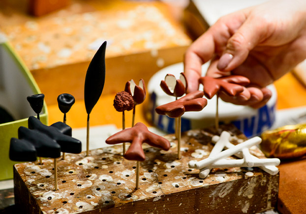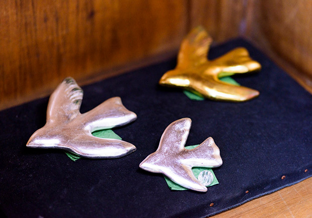 ジュエリーの土台は熟練の技で美しく彫り上げた木。それに膠(にかわ)や石膏、珪藻土(けいそうど)を重ねた後、純金箔や純銀箔、純プラチナの箔を貼り、瑪瑙(メノウ)で強く丁寧に磨き上げて仕上げます。