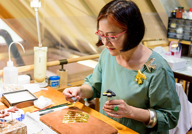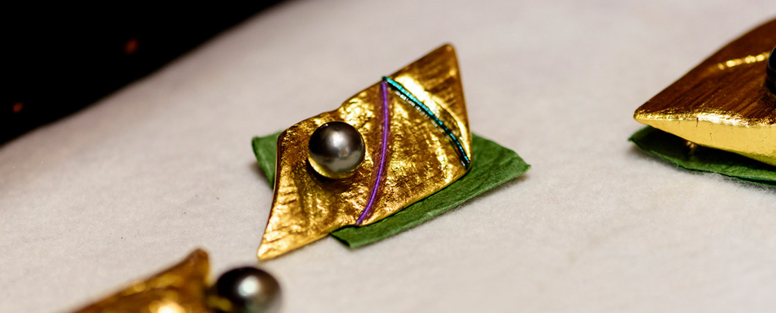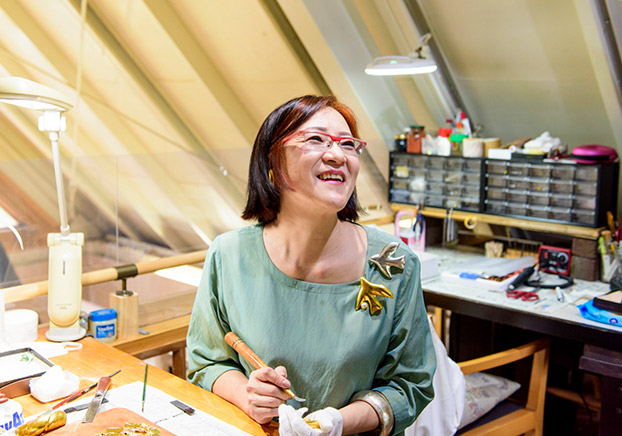 「ヨーロッパの技法を用いているので、私としては西洋的なイメージをもって作っているのですが、純金箔ならではの色合いの影響か、海外のお客様からは“オリエンタル!このようなジュエリーは見たことがない”と感動されることが多いんです。」