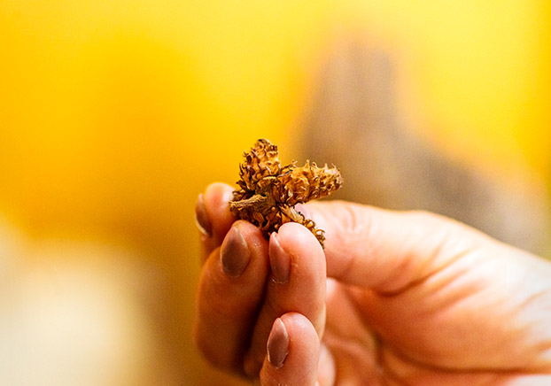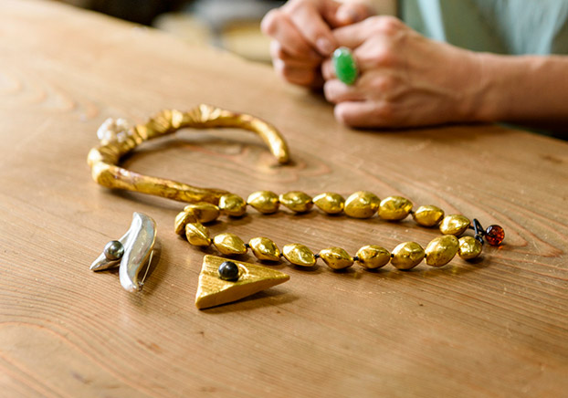 「生命を生み出す種や木の実って、ダイヤと同じくらい価値がある、どちらも大切。そう思いながら私は木を彫っています。金も銀も優れた素材。木と金箔をつなぐ膠もすごい。人間が作り出すことができない、自然の素材のすごさを感じながら、これからもずっとジュエリー作りと向き合っていきたいです。」