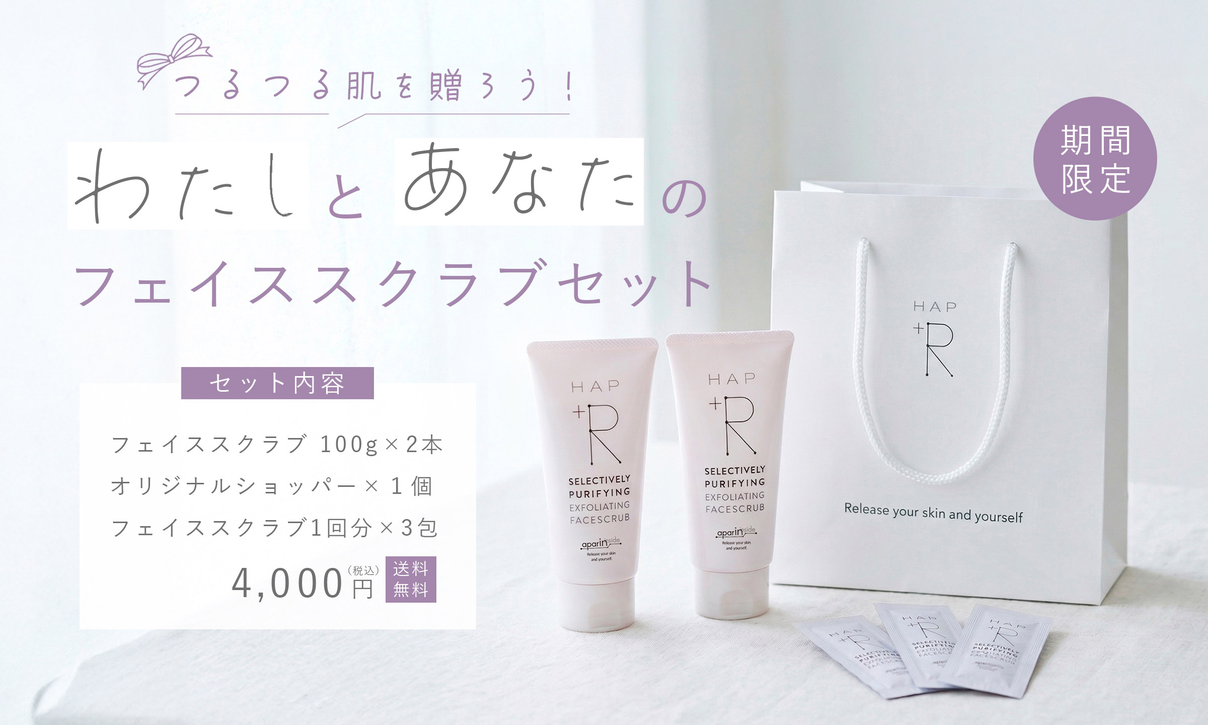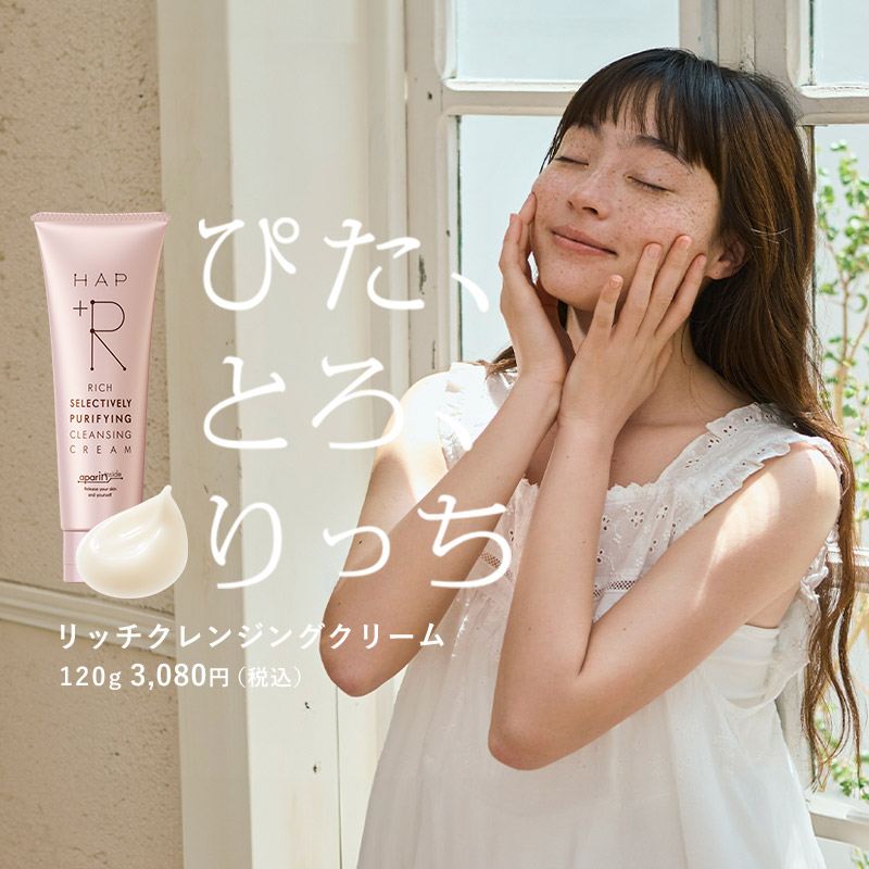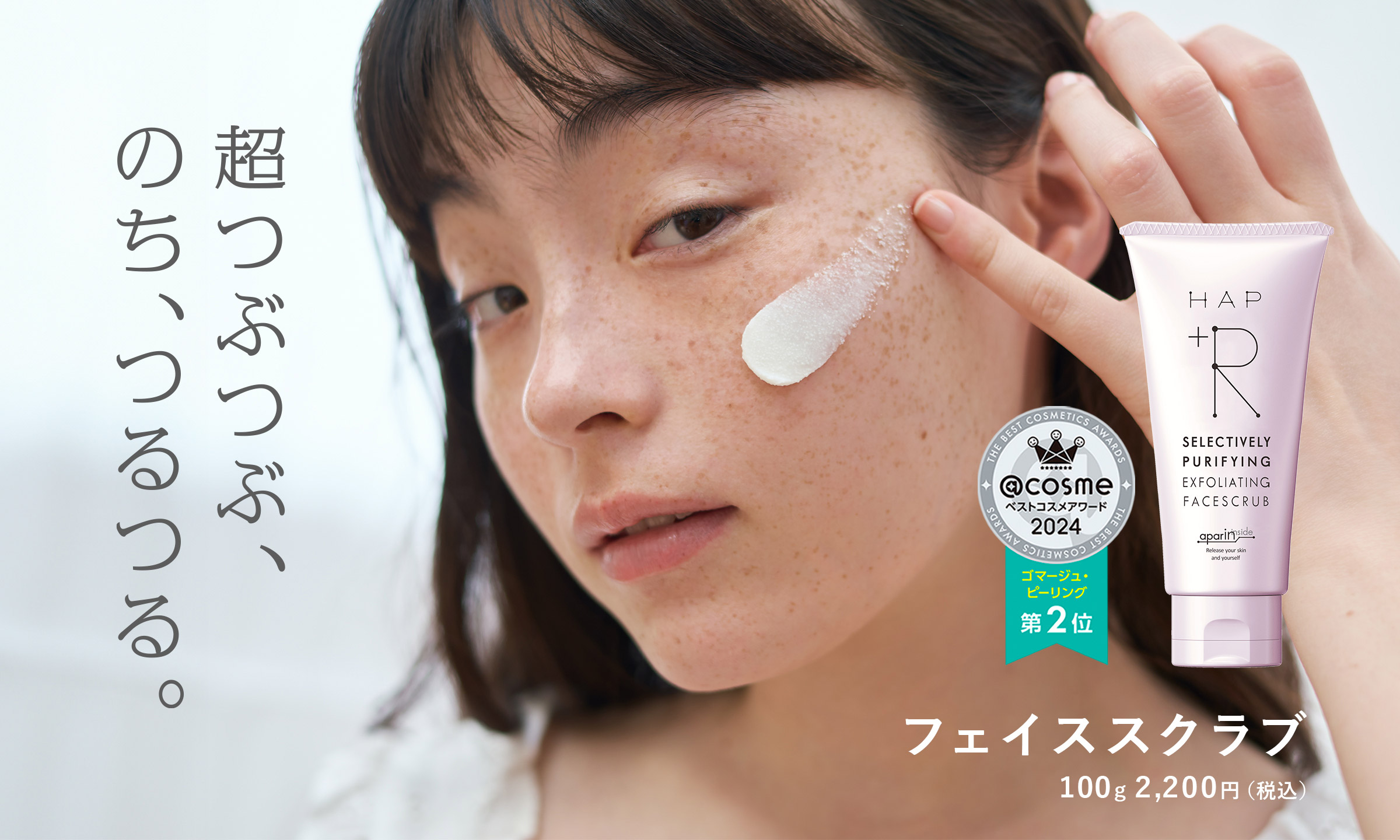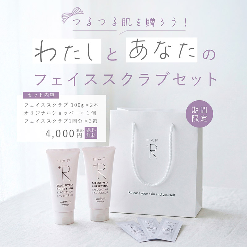 100g 2,200円(税込) - ざらつき、くすみ※1、毛穴汚れが気になる方へ、ハップアール初のスペシャルケアアイテム。スキンケア用アパタイト「アパリン®」※2 をスクラブ粒子に。酸化した皮脂や古い角質を吸着してオフします。心地よいつぶつぶ感のために、スクラブは丸い粒状につくりあげました。やさしくクルクルした後は、思わず触れたくなるスベスベ肌に。※1汚れや古い角質による